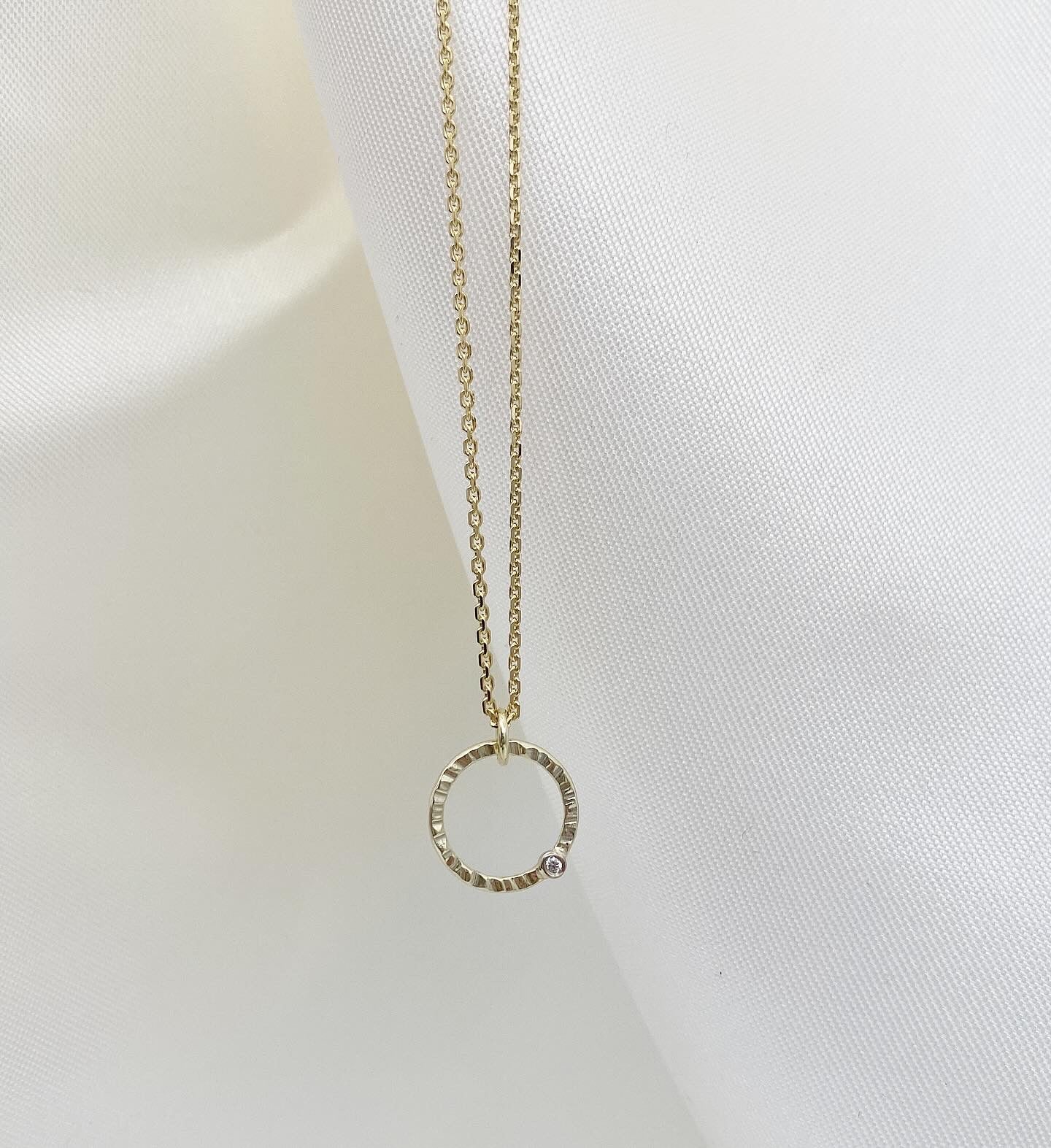 Roslega fallegt sígilt 14kt hamrað hálsmen með 1p demanti og gullhúðaðri keðju.