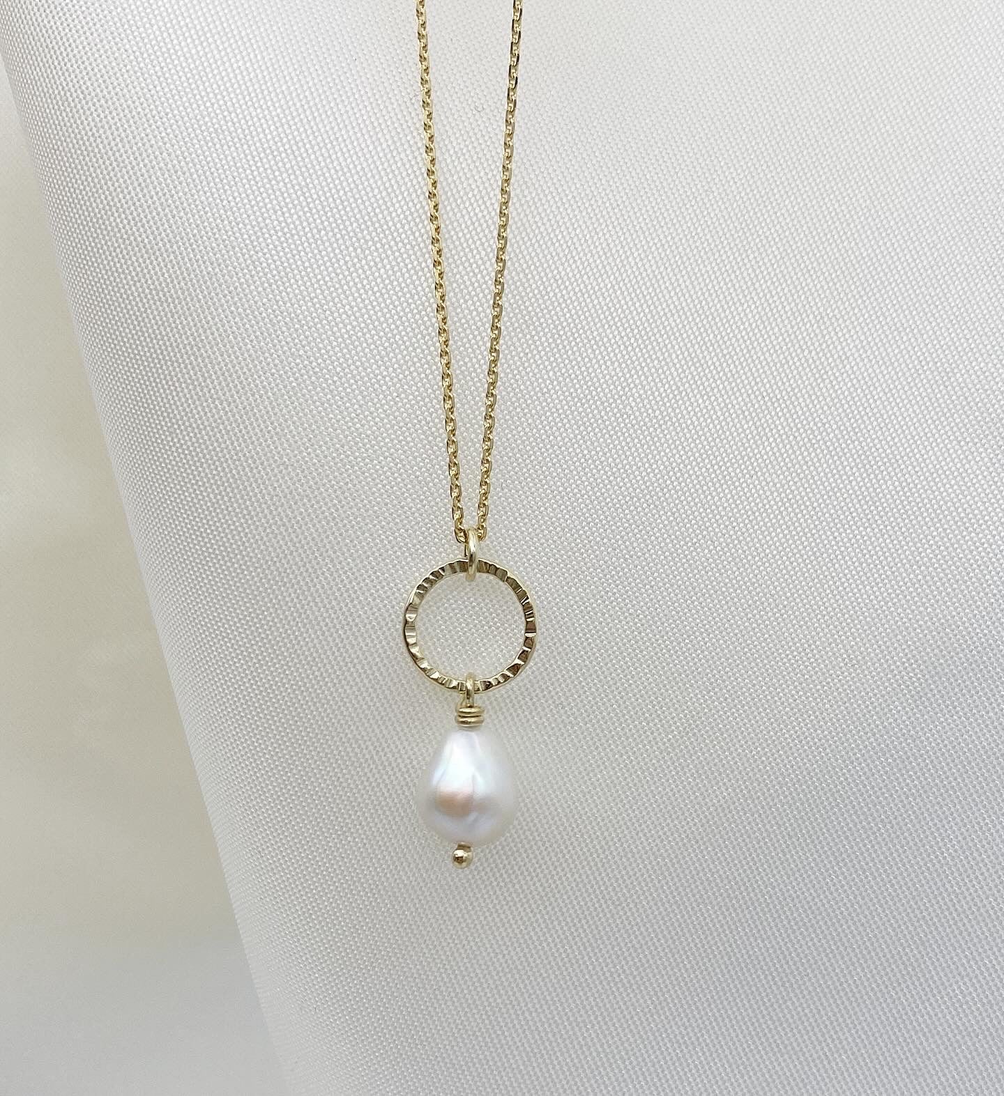 Hrikalega fallegt 14kt hamrað hálsmen með óreglulegri ferskvatnsperlu og gullhúðaðri keðju.