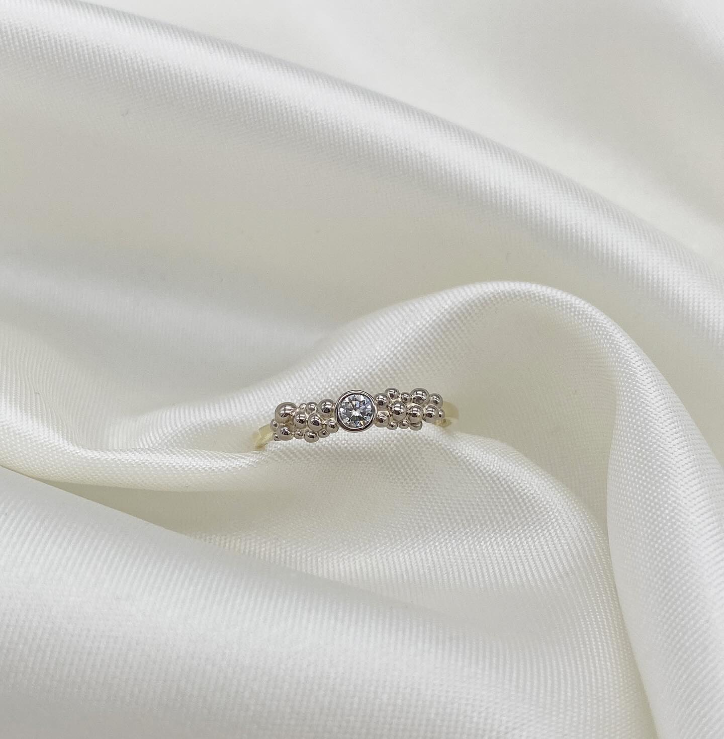 Einstakur 14kt gulagulls og hvítagulls kúluhringur með 15p náttúrulegum demanti.