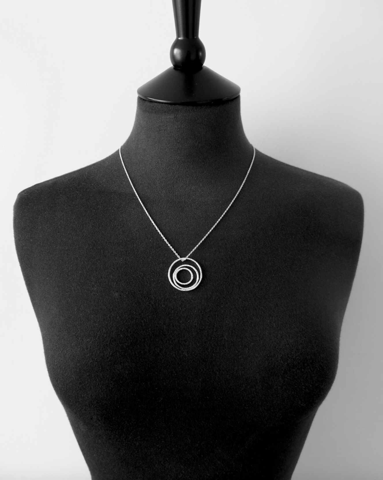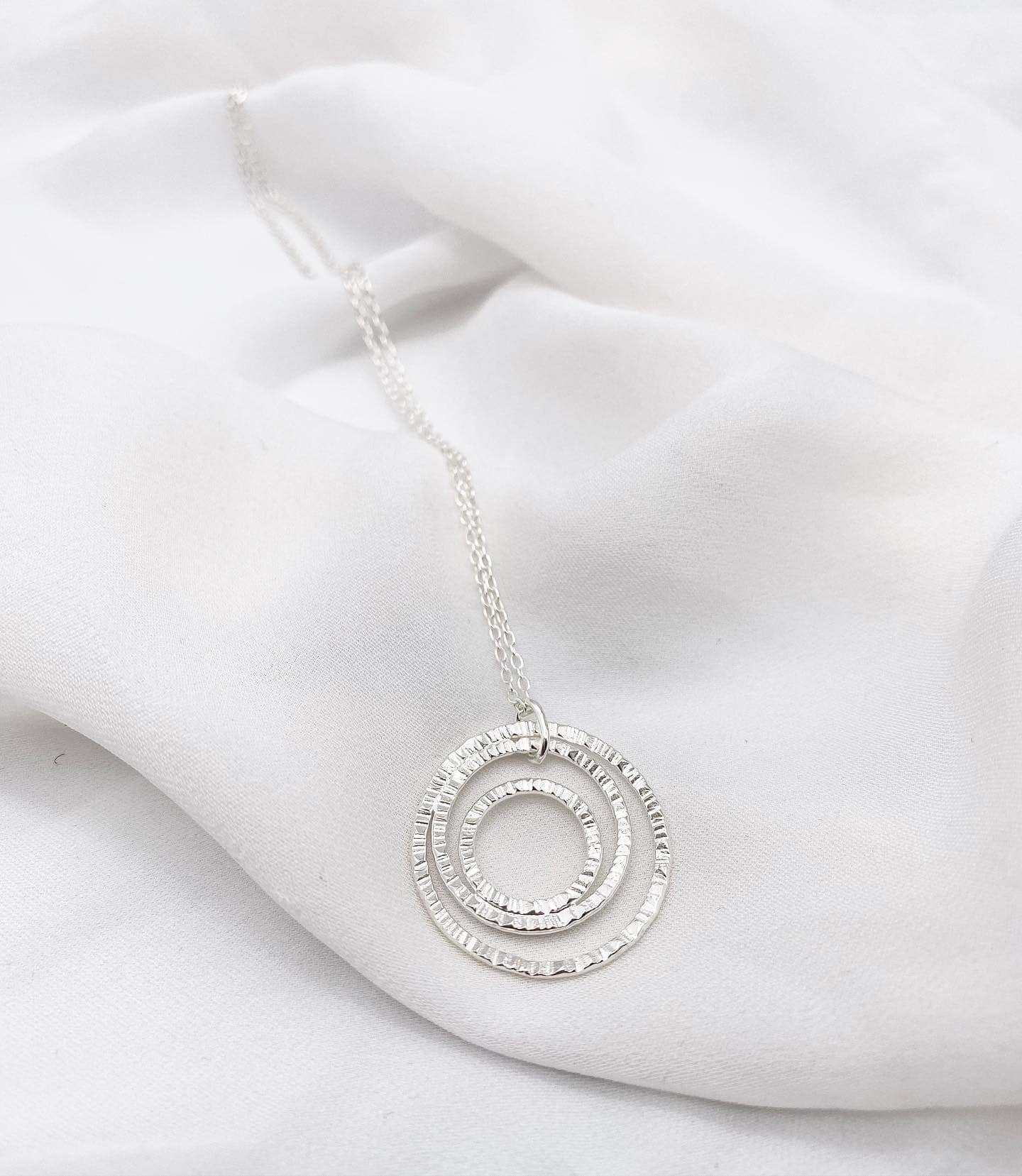Hamrað hálsmen með þremur hringum sem eru kveiktir saman. Hálsmenið er úr 925% silfri og fæst með keðjulengd 45cm til 70cm.