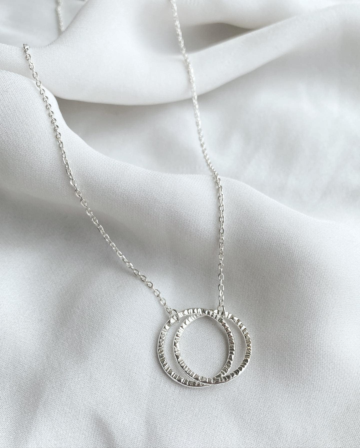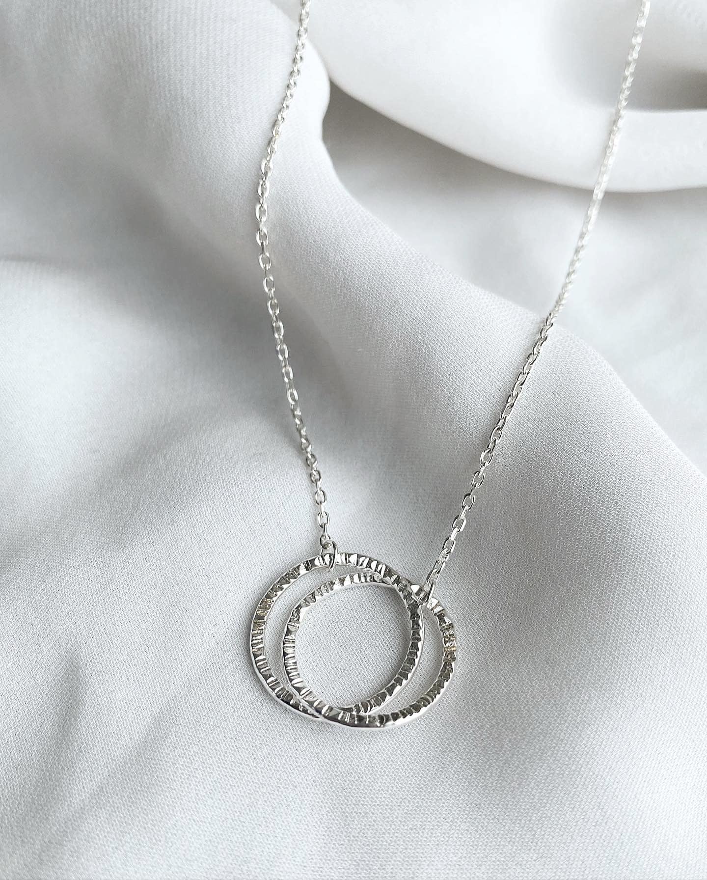 Fallegt og skemmtileg hálsmen þar sem tveir hringir eru fastir saman í hvorn öðrum. Hringirnir eru um 18-19mm í þvermál. Menið er fast í keðjunni.